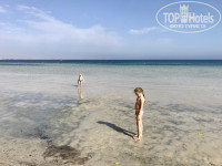 Море мелкое. Чтобы искупаться взрослому - надо метров 80 отойти от берега и будет вам по пояс. Для маленьких детей это просто находка - мелководье прогревается быстро и белый песочек, похожий на кинетический песок для игры самое то.