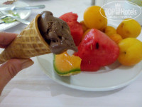 2. Ресторан большой, хороший, с террасой на улице, днем жарко, навесы не скрывают от палящих лучей. Питание нам понравилось- курица, индейка, говядина, рыба. Овощи-фрукты, выпечка, мороженое. Много чего делают на гриле. Готовят пиццу на обед и ужин. Завтраки хорошие. Кофе так себе, но в баре можно выпить из кофемашины (американо, эспрессо, капучино, горячий шоколад). Из спиртных напитков вина красное, белое, розовое (столовые градусов 9), водка, виски, делают коктейли и алкогольные и безалкогольные, пиво из теги. Наливают в стеклянные стаканы, если идешь к бассейну- в пластик.