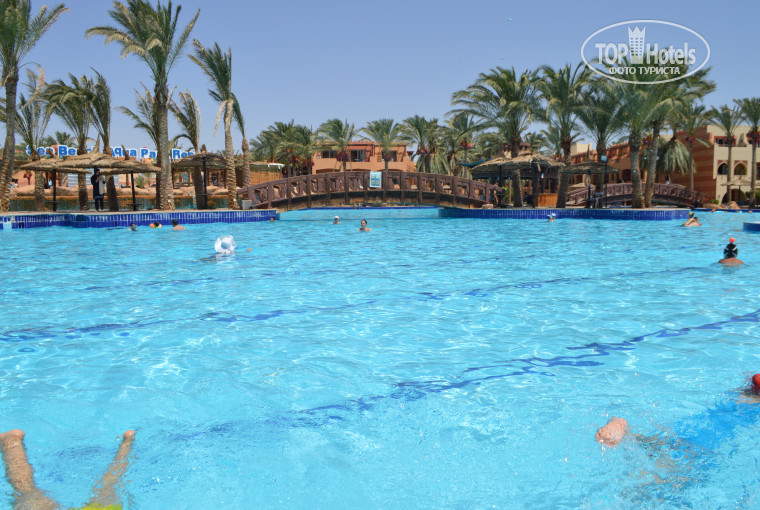 Территория отеля в целом красивая, создают вид все, что все моется и убирается, но это далеко не так, на барах очень грязно, поначалу я была в шоке, потом привыкла, стулья все липкие, полы грязные, кустики и газон подстригают всегда, ресторан на первом этаже просто ужас, там кушают в основном одни арабы, которые сами по себе очень мусурят, если бы их не было, возможно в этом отеле стало бы почище, туда я сходила один раз за весь отдых просто ради любопытства, но кушать там не стала. Мы всегда кушали в ресторане на втором этаже, в целом там не плохо, ребята быстро убирались, заменяли приборы, крошки правда прям при тебе стряхивали на пол, еда там была однообразная, но голодными мы не были, овощей было много, из фруктов только дыня, апельсины, яблоки, бананы в каком-то непонятном сиропе, арбуз дали один раз,морепродуктов было очень мало,из гарниров фри, рис, макароны и т.д. было всегда, завтраки также как и везде, омлет, яйца, блинчики, хлопья. Плюсом был большой выбор сладостей. Напитки: кола, фанта, спрайт, юппи, из спиртного пиво неплохое, все остальное я пить не рекомендую. Бассейны большие, поначалу вроде убирались, потом персонал на это подзабил, не разрешали плавать в футболках, хотя арабкам все можно было... Аквапарк неплохой, горки работали не все, дочке моей там очень нравилось, но опять же грязно, памперс пролежал там три дня, стаканчики ветром улетают в воду, никто их оттуда уже не убирает, потом на горках дети арабов не соблюдают никакой очереди, хотя инструктора пытались это контролировать. Море было очень теплое в любое время дня, дно жестковатое, лучше запастись специальной обувью, плюсом для меня был инстуктор, который предупреждал о приближении опасных рыб.