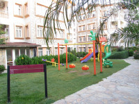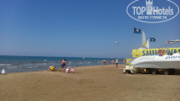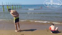 Мелкий песок. Заход в воду очень долгий - метров 50 надо идти по мелководью, по колено в воде. Дно мягенькое, песчаное, без камней. Заход в море узкий, с одной ограничен натянутыми понтонами, с другой - металлическим недостроенным пирсом (( лучше держаться от него подальше, особенно когда немного штормит. Все остальное, как на всех пляжах - бар с напитками, душ, переодевалка (1 кабинка)