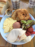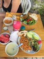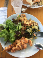 На обед и ужин: супчик, овощи на гриле, также разные салатики, второе было всегда (мясные тефтельки, котлетки, нагецы, курочка в разных вариантах- и тушеная, и жареная), и жаренная рыбка скумбрия- что-то одно на столе было всегда и всем доставалось)))) три раза на ужин шеф-повар готовил возле бассейна: 1 раз мясо на вертеле, 1раз куриные отбивные, 1раз куриные шашлычки на шпажках, можно было взять столько, сколько хочется.