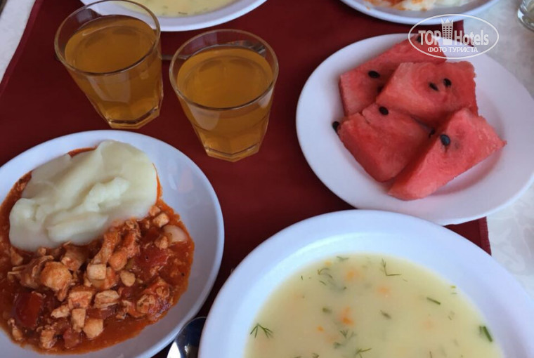 Обеды - по моему мнению,был самый сытный, горячее - супы, гарнир (картошка, рис, макароны) из мяса курица или печень, салаты, также были другие гарниры, но холодные, из фруктов только арбуз