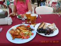 12.20 время приближалось к обеду. Рядом с баром ресторан. Размещаемся на улице за столом, уже открываются двери ресторана, в 12.30 начинается обед. В ресторане открывается не одна дверь, а несколько одновременно. Внутри работает кондиционер и прожившие небольшое количество времени туристы, занимают столики в самом помещении ресторана. Выстраивается не большая очередь за горячими блюдами. Далее есть столик, где стоят бутерброды, картофель фри и емкости с супчиками и хлеб. Дальше идут фрукты, торты и разные турецкие сладости. После разнообразные салаты, оливки, аджики, несколько сортов сыров. Стол с напитками размещен перед горячими блюдами. Огромные тарелки, похожие на подносы, по ложечке всего, хочется ведь все попробовать, получилось многовато… Переели…