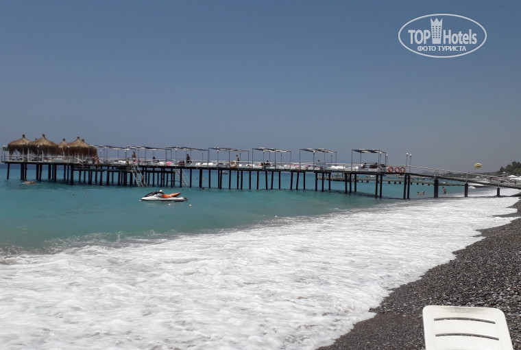 Пляж у отеля каменистый..обязательно берите тапочки!мы купили на территории .