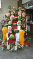 Много фруктов(арбузы.сливы и дыни.яблоки и апельсины!).Из основных блюд-мясо.курица.рагу и разные гарниры.