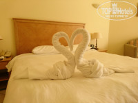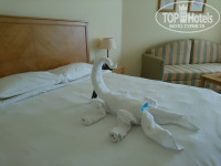 Первоначально впечатления были не очень. Прилетели утром, в 09.00 уже были в отеле, но заселять нас раньше не предложили, пошли прогулялись по отелю и сидели в лобби несколько часов. Номер дали в корпусе рядом с лобби, с видом на детский бассейн, достаточно с новым ремонтом, но по просьбе поменяли на поближе к морю, хоть и в старом корпусе и с "уставшим" ремонтом. В "старом" номере была стильная душевая кабина, в том, в который переехали, небольшая акриловая ванная. Номер по площади очень небольшой. Убирали хорошо и лебедей крутили, и мыло-шампуни обновляли каждый день. Мы оставляли небольшие чаевые.