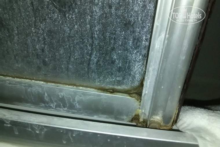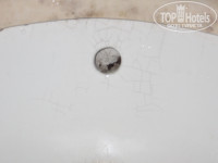 2. Номер. 1-й корпус, 3 этаж. Постельное белье и полотенца были поменяны. Полы были о-о-о-очень грязные. Попросили уборщицу протереть их. Она помыла, при этом оставив столько же грязи, сколько и было.И так было каждый день: пол мыли, а грязи не убывало. Я заходила в номер и убирала грязь влажными салфетками, демонстративно оставляя их на полу у входа. Но и их убирать не спешили. Во всех углах была грязь, пыль, волосы. Под кроватями, наверно, не мыли никогда! В ванной раковины в грязи и трещинах, под ободком - плесень. Краны в толстом слое налета. За все время их ни разу не мыли, как и унитаз. Душевая кабинка в таком же мерзком состоянии. (Жаль, что фото не передает это в полной мере). Постельное белье не меняли ни разу (но это не самое страшное). Двуспальная кровать была застелена поперек двумя маленькими простынями (видимо, в отеле не хватает денег на нормальные большие простыни). Вместо одеял - местами рваные тряпки, напоминающие вафельные полотенца! С включенным кондиционером спать холодно, а если выключить кондиционер, то очень душно и жарко. Одеяла не помешали бы. Очень непонятно происходила смена больших полотенец: меняли в лучшем случае одно из трех, при этом другие два (которыми мы уже пользовались) складывали на полку, как будто они поменяны, а то и вообще не меняли. Я уже стала ставить метки на полотенцах, чтобы знать, где чье. Иногда вылавливала уборщиков и меняла полотенца прямо у них. С маленькими полотенцами тоже самое.