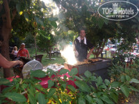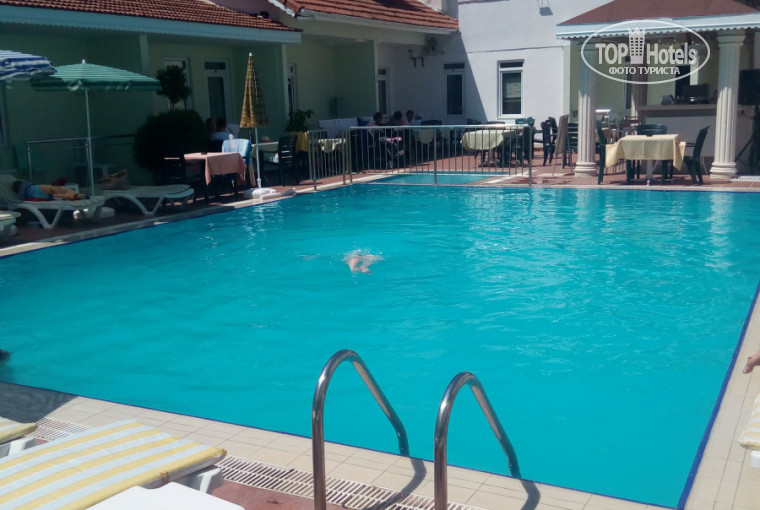Отель не большой, деревенского типа, рядом с морем (море чистое с хорошим заходом) лежаки платные(2-3 доллара) мы не пользовались. До моря идти по хорошей тратуарной дороге мимо магазинчиков и кафешек. Питание скромное и однообразное, но нам хватало ( завтрак яичница, блины были при вас готовят + шведский стол, всего не перечислить сыры, овощи, фрукты, вареные яйца, ветчина; обед - суп - пюре один и тот же, картофель, рис, макароны, курица, колбаса, салаты, овощи, фрукты (июнь были арбузы, виноград, сливы, абрикосы), ужин почти также курица и рыба на гриле при вас готовят ( иногда). Столовая располагается в красивом саду, с фруктовыми деревьями и детской игровой площадкой. Комната досталась 4 местная за доплату 4 доллара в день, я бронировала эконом, поэтому меня этот вариант устроил. Номер комнаты 624. В комнате 3 кровати ( 1 двуспальная, 2 полуторки), телевизор, фен, холодильником не пользовались (говорят все сломанные). Бассейн маленький по площади, глубина 164 см, рядом с бассейном небольшая барная стойка, теннисный стол, лежаков всегда хватало всем. Есть детский бассейн. Для тех кто хочет отдохнуть по скромному на море - хороший вариант. Главное понимать соответствие цены - качества. Анимации нет, хотя с детьми там много семей. Есть где погулять, рядом побережье, развалины древнего города, много магазинчиков.