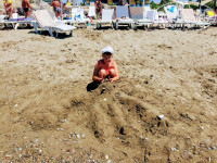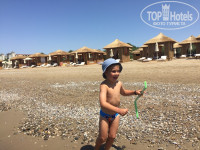 Пляж - большой, песчаный, постоянно ходят убирают. При том, что на каждом шагу стоят горшочки под мусор, некоторые люди умудрялись бросать мусор там же где и сидят/стоят, особенно неприятно когда детки играют в песок, а там окурки. Считаю, что на пляже, вообще, надо поставить таблички No Smoking!!! Лежаков много, есть удобные беседки, но бывало, что занимают места, а так до вечера и не приходят, тоже надо как-то уважительнее к друг другу относится. Вход в море пологий, где-то около метра галька, а дальше песок, около берега глубина комфортная для купания деткам, нет резкого перехода на глубину.