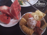 Утром на завтрак несколько видов молочных и безмолочных каш, омлеты, яичницы, отварные яйца ...и масса других блюд, перечисляю основное, для мамочек с детками, мои любили цветные колечки, шарики, хлопья с молоком или йогуртом. Естественно были выпечки и вкусные блинчики!!! В общем, питание отличное, качественное.Более того, помимо главного ресторана, есть еще и бары, где можно пообедать или перекусить, они нахолятся ближе к бассейну и морю, там готовят пиццу, картошку фри, гамбургеры, что-то типо шаурмы (вкусная),лепешки, а так же зелень, мясо на гриле, короче, можно кушать везде!!! Еще есть отдельные рестораны для обладателей черных браслетов (это туристы, которые уже повторно приезжают в этот отель или же те, кто зарегистрировался на сайте топхотелс и распечатает письмо, в котором повествуется, что вы едите в этот отель) я так и сделала...в этих отдельных ресторанах меньше народу, обслуживают официанты, и мороженое не только с 15 до 18, а целый день можно взять, ассортимент еды тот же...но мы в них сходили по разу и кушали всегда в итоге в основном))) Ещё эти браслеты дают возможность пользоваться вторым пляжем...мы туда сходили 1 раз чисто из моего любопытсва...нормальный пляж, если хотите меньше народу....там есть бар, дети мои скушали мороженку и мы отправились на общий.