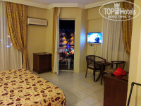Номер стандарт, большая комната с двумя окнами и крохотным балкончиком. Окна выходили на дорогу, но это совершенно не напрягало, стеклопакеты защищали от шума транспорта, а вид на ночной Мармарис в огнях был весьма красивый. Кондиционер работал исправно, немного шумно, но спать не мешал, было приятно прохладно. Wi-Fi не всегда стабильный, но позвонить или отправить фото вполне хватало. Номер был аккуратно прибран, сантехника исправная, чистая, вода была всегда. Два больших полотенца, два маленьких и одно напольное для ног, чтоб выйти из ванной. Меняли их через день, всегда были чистые. Уборка номера каждый день. Оставляли пару раз чаевые, но и без них уборка была такой же качественной. В номере две сдвинутые кровати, прикроватные тумбочки, зеркало со столиком, холодильник, ЖК-телевизор (2 или 3 русских канала и множество местных), уголок отдыха (два кресла и небольшой круглый столик), шкаф-купе для вещей, в нем же «спрятался» сейф, но мы его не использовали. Есть фен, электрический чайник.
