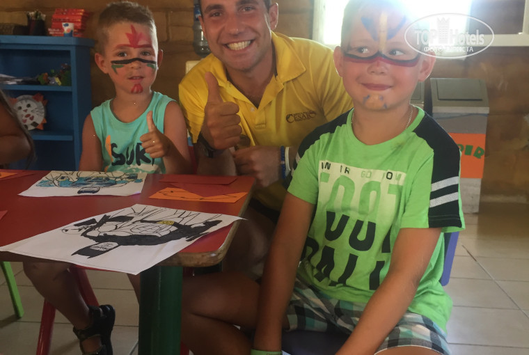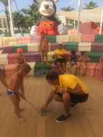 Каждое утро он занимается с детьми зарядкой/йогой, потом начинаются всевозможные музыкальные конкурсы, поделки из теста, рисуют, вырезают, даже гипсовали свои руки и потом раскрашивали на память. Каждый день в 14 часов аквагрим, далее турниры, победителей которых Кирилл награждает грамотами. Каждый день игры разные, не повторяются, поэтому детям очень интересно. Бывают даже тематические дни, например, день пиратов, в поисках сокровищ...дети вместе с аниматорами искали клад, спрятанный на территории отеля, а потом все получили подарки и танцевали под зажигательную музыку.