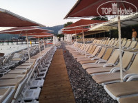 1) Пляж небольшой, места мало, лежаки почти вплотную друг к другу. Не понравились матрацы на лежаках- быстро промокают, медленно сохнут (для нас не критично- загорали мало, большую часть времени проводили в море). Крупная галька на берегу, непростой заход в море (проблема решается с помощью мостиков в воду и специальной обуви). Есть оборудованный пирс, на нем лежаки новее. Стоимость 1 места с 08:00 до 17:30- 6$. Напрягало курение на пляже.