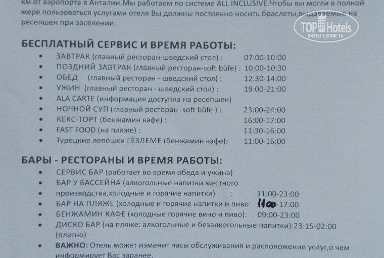 На обед и ужин дети по большей части ели картошку фри или картошку по-деревенски, мясо обязательно какое-нибудь, рыбу. Ну и фрукты, салаты. Вино красное и белое в принципе, нормальное, но я не люблю сухое, а там оно только такое. Пиво вполне нормальное, но пила пару раз. Коктейли вечером у амфитеатра пробовали - интересные, вкусные.