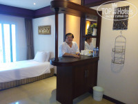 Прибыли в отель мы к 12.00 примерно. Заселили сразу же. Предложили номер делюкс, у нас забронирован был супериор. Но в делюксе 1 большая кровать, а нам нужны были 2 раздельные, и мы оставили супериор. Номер отличный, всё новенькое, чистое, всё работает, балкон выходит на бассейн. Там все номера с балконами на бассейн. Наш номер был 705. Позже нас всё таки переселили в делюкс)))) т.к. у нас потёк кондей. Номер конечно пошикарнее с огромной кроватью плюс ещё 1 маленькая)))), но балкон поуже был ( номер 506). В отеле видимо постепенно обновляют номера, слышали как стучат и сверлят в соседнем номере. При нас поменяли кресла и диваны на рецепшене)))) Теперь там новые красные диваны)