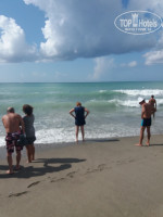 Волны кстати были на протяжении всего отдыха, но уже не такие сильные. Вход в море мягко говоря ужасен и дело даже не в том что сначала галька, а потом песок, вот после них начинается все интересное, то ли плиты там, то ли камни, присыпанные песком, но там где они на разном уровне лежат рядом образуется ямка с острыми краями и когда туда проваливается нога, то оцарапать может до щиколотки, весь отдых искали получше место попрыгать на волнах. Детей в основном все заносили на руках.