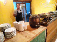 О еде... Привыкшая к европейской скромной отельной столовке, была несказанно удивлена, что и тут руководство отеля всех переплюнуло. Нет, голодными вы не останетесь. Вся байда с высоким названием "турецкая овощная кухня" присутствует во всех интерпретациях, лихо размазанная по блюдам на раздаче тонюсеньким слоем.Выпечка в едином лице "а ля куличек" из манки.