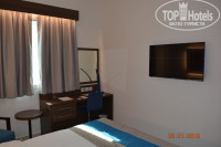 Номер вначале показался тесным, ну это конечно я сравнила с Кипром и номерами в отелях 3*, в которых мы были. Но как говорится их сравнивать не стоит. А так отдохнув после перелета, номер показался вполне хорошим. Кстати кто-то писал в предыдущих отзывах, что окна в номере не открываются. Не правда. Окна открываются, правда не по стандарту, а снизу вверх. Не знаю то ли у нас фиксатор окна был сломан, то ли мы просто не разобрались как правильно пользоваться, но окно если не фиксировать, оно закрывается. Но мы приспособились и затолкали пластиковую бутылку, в качестве фиксатора. Т.о. у нас в номере всегда было свежо и спать комфортно. Кондиционер в рабочем состоянии, но мы им не пользовались. Т.к. по ночам даже одеялом укрывались, ну а днём нас весь день не было. Приходили только переночевать. Душевая/санузел хорошие, удобно, комфортно. В номере бесплатный холодильник и сейф - это +++. Также ежедневно пополняется чайный набор: кофе, чай, сливки, а также питьевая вода в бутылках (из расчета на 2-х человек - 2 бутылки по 0.5л) - это тоже приятно порадовало, отелю +++.