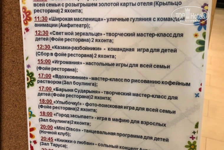 Итак. Резюмируя. Отель нашей семье понравился ОЧЕНЬ. По стоимости за четверых было очень приемлемо! С учетом того, какое количество мероприятий в день (прикрепляю 2 афиши) и что еда шведский стол: завтрак, обед, ПОЛДНИК и ужин! :) Ещё и концерт Антона Зацепина :) И столько приятностей!!