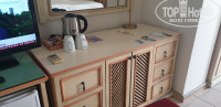В номере в наличии все стандартно для Турции, ну кроме халатов. Для ребенка двух лет была полноценная полуторная кровать. Вместо балкона терраска.Наборы в ванной пополняются, все приличное, кроме шампуня - мне не понравился, что-то непонятное. Если забыли - на территории есть небольшой магазинчик, где есть все такие мелочи ( и не только) и можно приобрести. Принимают оплату как в лирах, так и долларах ( можно не менять). Чайник с наборами чая и кофе, сейф, холодильник. Все как обычно.