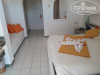 Мне предложили бунгало под буквой К..2 этаж и Z..1 этаж, конечно ради любопытства я их посмотрела, но все же попросила номер в основном здании. Без всяких доплат мне дали номер 238 в основном здании на 2-ом этаже с видом на бассейн и столики кафе на улице. Если бы не многочисленные бунгало и зелень, обзор с балкона охватил бы и море, но ))) Номер стандартный, трехместный, все работало, вечером в номере достаточно прохладно, система кондиционирования начнет работать с июня,есть ЖК телевизор, фен в ванной, 2 коробочки с мылом и 2 маленьких пузырька с гелем, 2 больших полотенца, 2 маленьких и одно полотенце для ног. Все стандартно, за исключением того, что в некоторых "трешках" нет фена, а тут он был и очень пригодился!)) Да, ключи были не карточкой, а что называется "настоящие" с плоским металлическим брелком размером больше самих ключей на котором указан номер комнаты, что в свою очередь не очень было удобно в носке, но акцент наверное делался на то, чтобы туристы наверняка не потеряли свои ключи)))