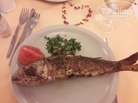 На обед всегда была рыба, овощной супчик, гуляш из говядины, курица и гарниры: рис, картофель фри. Из овощей понравилась цветная капуста, так же были помидоры, огурцы, оливки. В наличии были разные сладости, пицца и те же фрукты, что и на завтрак. Вино белое и розовое и пиво. На ужин почти тоже самое, что и на обед, за исключением того, что один раз давали мидии и крабов. В какие-то дни питание (мясо, рыба) было настолько скудное, что не знала, что и поесть))) спасали сладости. Да, еще два дня давали клубнику вкусную!!! И всегда на обед и ужин было мороженое 4-5 видов, для детей, да и для взрослых настоящее раздолье!!! Ходили в ресторан по А-ля карту: меню тунисской кухни, соответственно все острое, но надо же все попробовать)