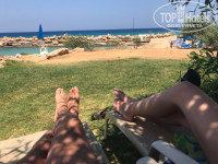 Дальше я двинул на пляж. Из отеля вниз направо, до упора, налево через отель Мимоза и вы на пляже/бухте. 5 минут спокойным шагом. Все пляже на Кипре - муниципальные, поэтому шезлонги платные и зонтики тоже. Я отдыхал на травке отеля Мимоза под веткой оливы, иногда брал шезлонг мимозы когда он свободен был - ну нахаляву. Но у них часто бывает рейд и они проверяют по спискам постояльцев кто занял их шезлонги - цена 4Э! Народу по будням мало, в выходные приходят местные и становится шумнее. Приезжает веселый мороженщик и продаёт мороженное в шариках по 2Э/шт. Где найти дешевое мороженное расскажу дальше
