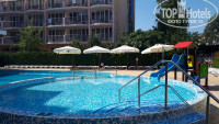 Отдыхали с дочкой 8 дней/ 7 ночей. 31 мая - 7 июня. Туроператор Анекс. Вылет 31 мая в 3.30, полет около 3 часов 20 минут. Утром в отеле. Есть русскоговорящий персонал на ресепшен.. В номер заселили по приезду, браслеты одели в 14.00. В первый день завтрак и ужин не включен. Поэтому поменяли евро на левы в Crown (курс 1. 900) и отправились на завтрак в город. Курс валют в обменнике при отеле такой же. Меняли в нем рубли на левы ( курс 0.255). В маркетах расплачивались по карте. Отель, территория и номер порадовали. Засели в корпус В, 5 этаж, с видом на соседний отель "L & B". В номере чисто, уборка ежедневно. В номере есть ТV, мини-холодильник, фен. На балконе сушилка для белья, стол и 2 стула. Единственный минус - подтекал поддон душевой кабины. Сообщили на ресепшен, но мастера так за 7 дней и не прислали. Уборщица номера, зная о проблеме, укладывала нам рядом с душевой полотенце. Для нас это было не совсем критично, но по этой причине за сервис 4, а не 5. Сейфа в номере нет, ценное закрывали на замок в чемодан. Лифты работали исправно. Доброжелательный персонал на ресепшен, в ресторане, в баре. Бассейны чистые, шезлонгов и зонтов всегда хватало. Вода в бассейне хоть и прохладная, но комфортная. Территория отеля хоть и небольшая, но вся зеленая, ухоженная, засаженная разными сортами роз. Начало сезона, людей в отеле мало. Комфортно, нет толкотни ни в ресторане, ни в баре, ни у бассейна. Отдыхающие в отеле интернациональные, - Россия, Молдавия, Польша, Голландия. Это те, кого определили. Возможно и др.страны присутствовали. Больше пенсионеров. Но встречались молодые парочки, семьи с детьмии. Анимация появилась буквально перед отъездом. Парень и девушка, предлагали играть в дартц. У детского бассейна проводили занятия с детьми. Питание хорошее, на завтрак каша, омлет, сосиски, бекон, брынза, сыр, консервированные фрукты, колбасная нарезка и йогурт, болгарская молочка "кисле мляко" - очень вкусно с медом, на обед 2 вида супа, гарниров и горячего несколько видов, салаты, овощные нарезки, соления, свежие фрукты: апельсины, киви, персики, нектарины, абрикосы, яблоки. Жаль, что ни разу не давали клубнику и черешню. Ужины тоже сытные. 2 раза за неделю были креветки. Читала в отзывах прошлых лет о питании, что были мидии. В наш заезд не было, поэтому за ними отправлялись в городские рестораны. Неплохие рыбные блюда: рыба запеченная, рыбные рулеты. Из мяса: свинина, говядина, баранина, курица, печень. Каждый день разные блюда на обед и ужин. На обед и ужин горячих напитков нет. Брали чай из бара и приносили в ресторан. Не порадовала выпечка. Но может это и хорошо) В баре рядом с бассейном с 10 до 17 мороженое. Там же выкладывают печенье. Из напитков пробовала пиво, вино, ром. Вино по качеству на троечку. Пиво нормальное. В этот раз погода в Болгарии порадовала. Дожди были пару раз ночью и 1 раз днем, когда поехали на шопинг в Бургас. Дни были солнечные, иногда перменная облачность. Загорали, купались, море 22 гр. На пляж быстрее всего попадать, если выйти из отеля и повернуть направо, пройти мимо соседнего зеленого отеля L&B, за ним повернуть направо в перелесок, пройти по грунтовой дорожке до асфальтированной и повернуть налево, пройти метров 50 и справа будет невысокое заброшенное здание и калитка. Проходите через пустырь, впереди отель Оазис. Переходите через дорогу ориентируясь на Оазис, дальше придерживайтесь левее, в