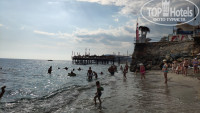 Пляж - 5 с минусом - с одной стороны он маленький и у него неудобная лестница для спуска, с другой стороны он природный, у него хороший заход в воду без бетонных плит как рядом, есть слева за камнями дикий закрытый от внешнего мира пляж с крутой пещерой, на пляже много лежаков, есть уютные места для сна и отдыха над пляжем, зона с гамаками, огромный пирс с джакузи и спуском к морю, ресторан у воды и т.д.