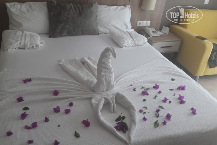 На ресепшен напомнили что молодожены(обещали комплимент в турагентстве), но реакции не последовало. Заселили почти сразу, т. к. приехали в 14 ч. На следующий день разговаривали с администратором, упомянули несостоявшийся "комплимент", после чего нам горничная скатала одинокого лебедя на кровати и рассыпала цветочки на простыни.