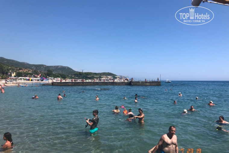 5. Море кристально чистое, вход в море галечный, но есть несколько мест "комфортного входа в море", где уложены мешки с песком в форме ступенек. Глубина нарастает достаточно резко, на расстоянии 10 метров от береговой линии глубина моря около 2 метров. Пляж регулярно убирается. Лежаки и зонты над лежаками в наличии, за время нашего отдыха мы не попадали в ситуацию, что нет свободных лежаков.