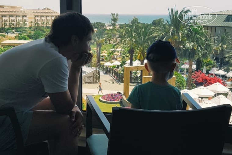 Номер: Нам полагался трехместный номер. Он довольно большой. Также в номер по запросу устанавливают детскую люльку-манеж. Балкон большой, на котором размещены 2 пластиковых стула и столик. Также есть сушка для одежды. Вид из нашего номера выходил на соседний номер и на море. Нас номер устроил. Также понравилось, что в ванной комнате ванная, а не душ. Убираться стали каждый день после того, как обратились на ресепшн, т.к. не могли согласовать график уборки и сна детей. Но все решили в течение 5 минут после нашей просьбы.
