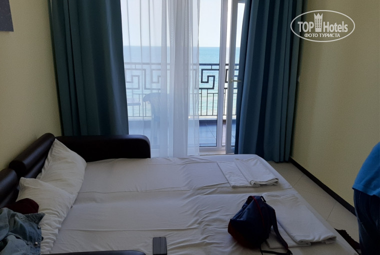 4.Первое заселение прошло мгновенно, номер достался лучше чем бронировал, бронировал люкс с одной комнатой, получил люкс с двумя. Я отдыхал с женой и сыном 15 лет, поэтому ставлю плюс. Номер конечно не новый, но все исправно работало, шампуни, гели, полотенца, тапочки присутствовали. Вода горячая была всегда, хотя у нас был последний этаж. Большой балкон (выход из двух комнат) с прекрасным видом на море.