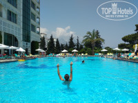 Основной бассейн при отеле оборудован тремя горками (дети были просто в восторге) и лежаками с матрасами (бесплатно). Рядом расположен бар с тонизирующими и крепкими алкогольными напитками местного производства. Делают различные коктейли, каждый может подобрать напиток себе по вкусу. Мне понравился Джин-тоник, а супруге Бейлис. Приятные, квалифицированные бармены, всегда встречают с улыбкой и шутят. Особенно стоит отметить барменов: Umut, Zafir, Onur. Umut всегда удивлял новыми коктейлями детей и супругу. В гостинице еще есть лобби бар, в нём хорошо ловит WiFi, можно уединиться, спрятаться от жары.