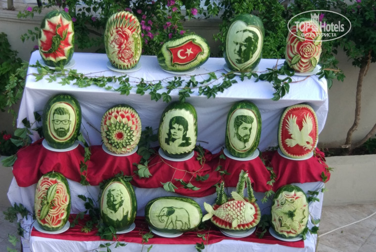 Очень много тортов, пирожных, фруктов( арбуз, дыня, сливы, яблоки, груши). Хлеб конечно всегда наисвежащий с корочкой хрустящей, ни одного дня не было, чтобы на 2 день оставался он.