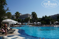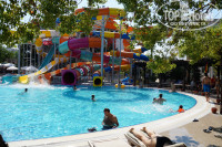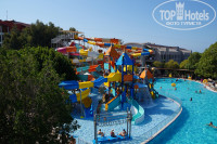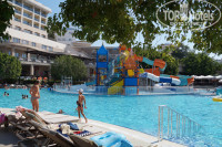 Территория отеля большая - 80 000 кв.м., но в то же время очень удобно спланировано размещение всех объектов. Есть зона с бассейном для совсем маленьких детей (высота 35 см.) и горки для ребят от 2-х лет до 7. Этот бассейн плавно переходит в бассейн для взрослых (в нем проводятся водные шоу, танцевальная аэробика и вечеринки у бассейна). Также есть большой бассейн у аквапарка (от 1,4 м.), в аквапарке две зона для ребят от 4 лет до 10 и от 10 лет до пенсии). Есть бассейн у ресторана внизу и бассейн на террасе на втором этаже, и один крытый бассейн в зоне хамама. В аквапарке есть горки с ватрушкой и без, работают инструкторы и следят за спусками с горок. Для детей аквапарк хороший. Но ватрушек на мой взгляд маловато. Их приходится вылавливать( Пробы воды в бассейнах берут каждый день несколько раз и записывают на спец табло у ресторана. Лежаки у бассейна надо занимать рано утром, до 8 часов. Потом свободных нет.