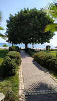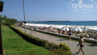 Пляж у отеля большой, по обе стороны от выхода. Не скажу, что он чистый как сахарный песок, но более или менее нормальный. Вход в море пологий, полностью песчаный. В предыдущих отзывах было написано, что лежаков на пляже не хватает - неправда!!! Ходила и утром, и в обед и вечером, лежаки можно найти всегда, нужно только пройти чуть дальше от входа. Некоторые зонтики уже поизносились, матрасы на лежаках все старые. Развлечения на пляже есть (парашют, гидроцикл, банан), но платные. На выходе из пляжа есть душ, туалет.