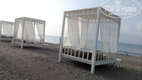 вода в море на песочном пляже (для всех гостей отеля) не перемешивается и идет слоями холодная речная и теплая морская, соли в воде меньше. Мне это не очень понравилось, к тому же, вода тут грязновата, особенно, во 2 половине дня. Есть обычные лежаки под тентом (всем хватало), есть "домиком" на газоне - вот их люди занимали с 5-6 утра.