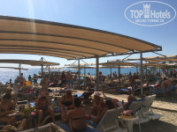 Отель на второй пляжной линии, хотя море из окна видно. До пляжа 5 мин прогулочным шагом через две дороги и дальше по городскому парку. По шагомеру 261 шаг. Лежаков штук 300 есть столики. Матрацы грязные подношенные, но при помощи больших пляжных полотенец эта проблема решается. На пляже отличный пирс на нем около 100 лежаков их занимают пораньше. А вообще даже те кто приходил на пляж в 10-11 часов могли найти себе лежак. Вход в море пологий мелкая галька и камушки. Специальную обувь с собой брали, но не пользовались. На пляже ОДИН роутер и ВТОРОЙ на пирсе, интернет позволяет принимать видеозвонок. Целый день специальный работник следит за чистотой и производит уборку. Слабым местом, на мой взгляд, есть бар. Из напитков пиво, кофемашина фанта кола спрайт, а с 12 до 16 гамбургеры. Своего туалета у отеля на пляже нет. Туалет на пляже городской.