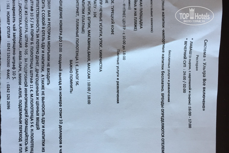 Приехали в отель ночью, заполнили все бумаги и сразу одели браслеты , сумки в этом отели и не пытались помочь отнести , пошли на ночной суп выбор был но не большой по еде. Зашли в номер и начался ужас , светильник у Кровати весел на соплях, дверь в ванную была в каких-то брызгах о происхождении которых можно было только догадываться, душ кабина так называемая протекала с низу и вода текла по всему полу, сифон на раковине я ремонтировал сам так как вода текла на пол ручьём . Одно полотенце было в пятнах хотя они были постираны , сейф в нашем номере был вырван , номер пыльный был изначально и таким был до конца отдыха. Мыло как закончилось в душевой так больше его и не меняли , зеркала грязные дверь в ванную с низу прогнила из за проблем что я перечислял. Нам сказали сфотографировать мини бар так как он был полностью платным и недостаток чего то будем оплачивать , нам об этом сказала женщина из спа , воду вам не дают, и не разрешают заносить в номер со столовки , иначе штраф 10 дол это написано возле лифтов. Хочешь пить ночью пей с крана или спускайся в низ к бару. В номере есть Електро чайник и рядом бумага в которой написано нагревать только воду, чай запрещено штраф. По еде : голодными не будите , но по факту ассортимент не большой. Каждый раз когда что то толковое выстраивается очередь в километр утром очередь за омлетом вечером по гриль. Рыбу ел всего раз за 8 дней. Соков нет только порошковое подобие, которое если закончиться то не спешат менять. Фрукты дыни . Арбузы , виноград. Яблоки , груши и пару дней давали апельсины, возле сладкого видели таракана как и на территории отеля. Выпивка это капец виски, джин это спиритка . Только раки турецкие можно было пить. Коктейли платные . На пляже безалкогольный бар где выпить можно юпи , пепси, кола и.т.д. Шезлонгов на всех нету надо идти утром рано и кидать своё полотенце, полотенца к стате не дают в этом отеле.мы брали свои с дому. Своей территории у отеля нету по этому люди с 4 ки приходят кушать в 5ку и создаются мега очередя что касается и шезлонгов. Персонал бестактный , могут Забрать тарелку ,стакан хотя ты не закончил есть , пить , не раз видел конфликты по этому поводу. Раз я шёл на улицу с тарелкой и один с персонала протирал что то тряпкой а потом решил кинуть его своему коллеги , я еде увернулся , на мое недовольство те только улыбались .есть в этом отеле один разводяга он себя назвал Валдемар но его колега сказал что он себя кличет Ричардом но по ходу он Вася . Под никнеймом Ричард он сильно прославился так как разводил на массажи по космическим ценам , а когда мы приехали он уже стал Валдемаром )) этот товарищ цепляется к людям и на улице и при обедах и ужинах, входа в отель с непонятного базара . Горки в отеле все по расписанию , так как и бассейны , время кончилось свистят в свисток и все на выход. Анимацию дневную я не разу не видел. А вечерняя полный бред . Как то после ужина женщина плакала что у неё украли 100 долларов и личную вещь. Выезд из отеля это была вишенка на торте, в 2 :50 ночи 26 сентября мы ждали трансфер в аэропорт , возле рецепшена стояла девушка которая являлась туристом из нашего отеля рядом стоял парень , мы его раньше не видели , мужчина из рецепшена отеля и парень из отельной охраны, у них явно был о чем то спор , я особо не вникал , мы пошли на ночной суп после чего услышал громкие крики и хлопки как врод