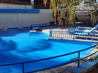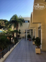 Территория. Отель состоит из двух корпусов: основного двухэтажного здания и дополнительного корпуса BLUE. Территория отеля ухоженная, зеленая. Растут пальмы, оливковые и банановые деревья, цветы, бегают ящерки. Два бассейна: детский лягушатник и взрослый большой бассейн с глубиной от 1,1 до 1,9 метра. Терасса для загара с бесплатными лежаками, душ. Рядом с бассейнами находится бар со столиками. Бар работает с 10:00 до 22:00. Для тех у кого полупансион все платно, у кого все включено бесплатно мороженое, кофе, чай, пиво, вино, газированные напитки, сок. Импортный алкоголь платно.