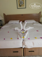 1. Номер. В отель приехали утром, засели нас в 11 часов в просторный номер с видом на бассейн. Из техники в номере был сейф, холодильник, телевизор, фен, кондиционер. В номере все работало кроме фена, но потом по нашей просьбе его к обеду починили. В ванной были полотенца (меняли каждый день, делали разных зверушек) и жидкое мыло, больше ничего. Вода с хлоркой (пить ее нельзя), но в номер каждый день ближе к вечеру приносили по одной бутылке воды на человека. Ящериц в номере я не видела))