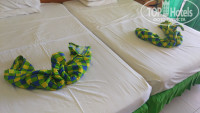 Номер: Номер нормальный, немного пошарпанный, но нормальный. Проблема с освещением правда – вечером, даже когда максимум включить света, небольшой сумрак, но нам не мешало. Есть: Стол, ТВ с НТВ Америка, 2 табуретки, минихолодильник, зеркало, 2 сдвигаемых полутораспальных кровати, 2 тумбочки, 3 торшера, мягкое кресло, картины, на балконе 2 пластиковых стула и стол, 1 сейф, работающий от карточки двери, 5 ящиков, шкаф с вешалкой, ванная комната, есть фен, в номере есть как местные так, и европейские розетки в достатке. Не работали или плохо работали: 1 торшер, унитаз подтекал снизу - приходилось кидать перед ним полотенце, одно стеклянная створка на балкон, которая дальше от балкона не двигалась, открывалась только та, что ближе к балкону - проблема решилась не дюжим мужским усилием по её сдвигу с приподниманием, заимствованием из столовой оливкового масла в небольшую ёмкость и смазыванием направляющих. На наш отдых хватило, чтобы нормально открывалось, думаю еще на пару отпусков тоже. Мыло, гель для душа, шампунь (кажется из одной бочки), туалетная бумага, есть и выдают. Воду 1.5 литра не всегда выдают, можно набрать в кулере в столовой, теоретически и из-под крана питьевая (пил несколько раз, в том числе в аэропорту - всё ОК). Номер убирают каждый день. Вода горячая у нас была всегда, на верхних этажах в часы пик пропадала говорят.