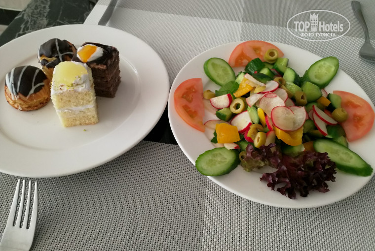 Утро у меня начиналось рано , в начале шестого с мечети отчётливо и громко доносится молитва. Потом я опять засыпала. Питание мы брали полупансион: завтрак и ужин ( ужин легко можно поменять на обед, сказав на завтраке персоналу,что будете обедать и в каком часу). На завтрак мы приходили в 7-30, раньше там делать нечего: одни китайцы, за ними потом быстро убирают и можно спокойно завтракать. Еду тоже быстро докладывают,если заканчивается, так что не портите себе трапезу, приходите позже. На завтрак есть всегда молочная каша или суп, вареные яйца, нарезки из овощей, зелень,два вида хумуса, кексы,сыр, масло, фасоль в томатном соусе, несколько раз давали йогурты в баночках. Есть так же сосиски, картофель фри,нагетсы, хлопья. Обед порционный и не блещет разнообразием: это одна тарелка салата на двоих, маленькая плошка супа и либо три кусочка рыбы,либо куриного филе,плюс картофель фри и вареные овощи и пирожные. А ужины были шикарные,если был шведский стол, давали часто рыбу в кляре, тушёное мясо, даже язык и кальмары,салаты разнообразные, на сладкое было много всякого ,но я не ем, а мужу нравилось.