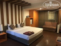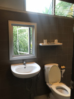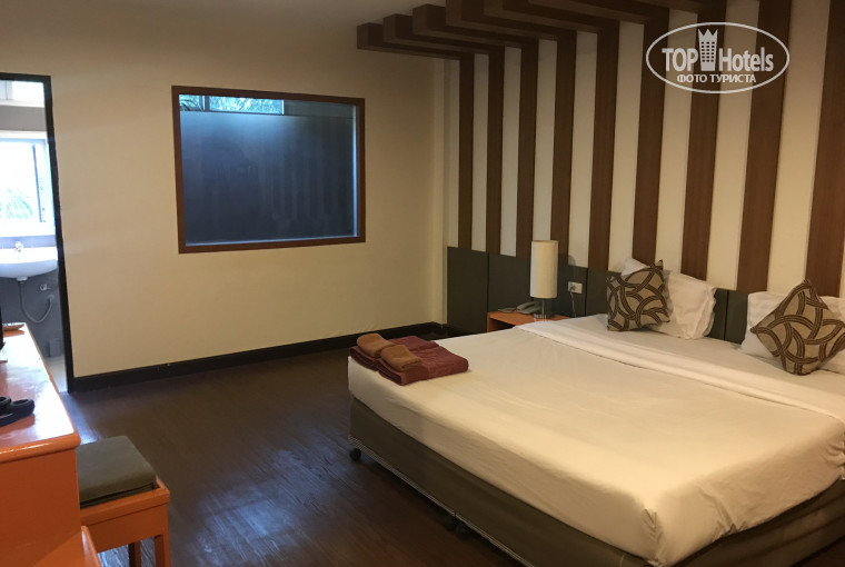По пугающим отзывам мы были готовы ко всему самому страшному. Номер оказался довольно просторный, большое окно в комнате было заклеено пленкой и выходило на бывший балкон, где теперь располагается душ и унитаз. На балконе-туалете открытые окна, в которые заглядывают ветви пальм. На первый взгляд номер кажется довольно таки симпатичным, если особо не приглядываться к мебели, а она просто жесть… окрашена в оранжевый цвет, как раньше в частных домах полы красили, краска во многих ободралась, так что вид удручающий. В номере есть холодильник, сейф, фен, сушка для вещей. Чайника в номере нет, но как я поняла, кипяток можно набирать на первом этаже. Освещение очень тусклое, одна лампочка была перегоревшая, заменили по требованию. Даже при таком свете мы заметили, что белье все застиранное и в неприглядных пятнах. Кондиционер включался раза с третьего, один раз не смогли открыть дверь, пришлось идти на первый этаж, пришел работник – побрызгал чем то и замок заработал. На третий день стала протекать труба под раковиной, пришлось сообщать на ресепшен. Горячей воды нет совсем, только комнатной температуры и напор ужасно слабый. Было дико, что в номере нет вай фая, только в холле на этаже, либо на первом. Дали пароль от него, который не сохраняется и приходилось каждый раз его вводить заново. Потом плюнули на него и пользовались местными симками. Первые 3 дня мы были в полном шоке и совсем не хотелось идти в номер. Каждый день приносят по 2 бутылочки воды, туалетную бумагу, меняют полотенца, белье меняли раз или два. При заезде разово дали по 2 маленьких кусочка мыла, одноразовые шапочки и ватные палочки. Геля для душа нет. Очень неудобный умывальник, в нем нет заглушки, с помощью которой можно наполнить в раковину воду и постирать белье. На ресепшене брали пляжные полотенца, за них нигде не расписывались, вечером возвращали их в использованную корзину.