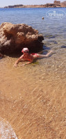 Кораллового рифа почти нет, надо идти еще левее, примерно 1 км от основного пляжа, но без обуви не зайдёшь; вот там есть не большой коралловый риф.