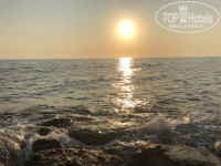 Центральный это плиты и камни. Левее ооооочень мелкие камешки, или крупный песок. Ещё левее дикий с гротами, маленький, мелко-песчаный. Но! На втором рыбки кусачие невозможно. Хотя, там были с детьми и так же там пирс. С него купались, на нем загорали. Дикий пляж красивый, уютный. Мы выбрали плиты и камни. Нас спасли тапочки и ничего это не доставляло неудобств даже моей маме с больными коленями. С нами же купался мужчина после операции и на костылях. Тем более, пройти гладкие камни и начинается песок! Просто тропка там есть вдоль рыболовного пирса. Напротив ступенек к пляжному кафе. Мороженое, кстати, объедение!!! Неограниченно можно брать. Дитё у меня объедалось (ваниль, фисташка, шоколад и земляника. Земляника оч сладкое). Море просто горяченное было! Я такое обожаю! Проход к морю, кстати, с -4 этажа лестница и переход. Везде по отелю лифты и пандусы, что в принципе, даже для людей с ограниченными возможностями, удобно. Так, что море красивое, чистое, ласковое. Мы купались даже в небольшой шторм (2 дня), даже на камнях.
