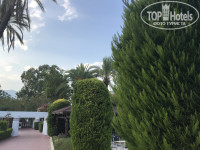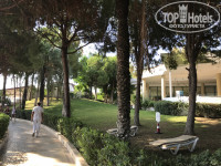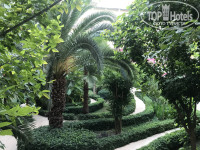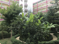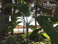 На территории есть фонтан с подцветками, много сосен, пальм, цветущих кустарников.