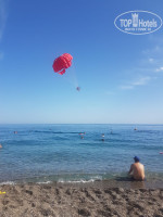 Море)чудесное, чистое, теплое, восхитительный обзор на горы, температура воздуха днем до +30, пару дней было облачно, местами дождик😃 Вечером уже прохладно. На пляже предлагают парашют и банан, сфотографироваться. Понравился юмор мужчины Не спать.. Не спать.. Зима приснится.. Замерзните или У нас можно слетать бесплатно в один конец))) Спасибки...Такие добрые шутки делают мир более позитивным🔥🎉