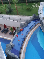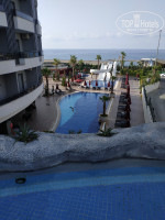 Выйдя на балкон, который был по своим размерам большой, по сравнению с другими отелями в которых мы были в Турции. На балконе была сушилка для вещей стол и два стула. С нашего балкона открывался нам вид на бассейны, очень красивые, голубые и на море кусочек был виден, ресторан и бар.